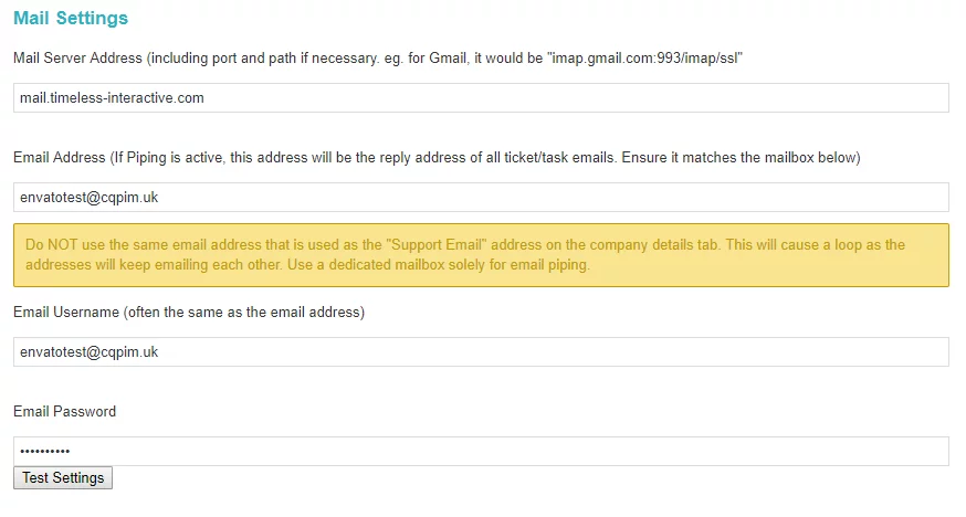TIP: When setting up email piping you should NOT use the same email address that you entered in the support email field on the “My Company” tab of the plugin settings. You should use a dedicated email address eg. piping@yourdomain.comIf the test returns “Settings are Correct”, then the mailbox is contactable, the script can log in and email data will be returned to the script. If you receive “Failed to connect to mailbox”, then move on to “Common Problems” further down this page.