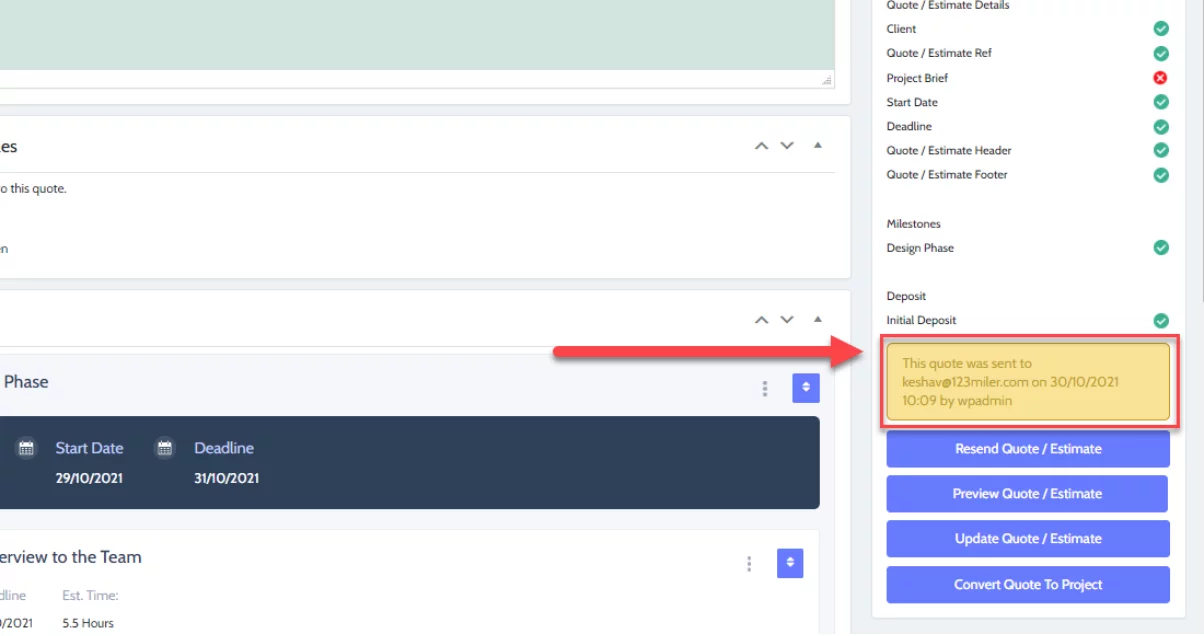 Now that your quote is ready, you need to let the client know that it is ready to be accepted by them. To send a quote, simply click the “Send Quote” button in the Quote Status metabox. This will send the client a notification within the system and via email, letting them know that a quote is ready to view and accept.